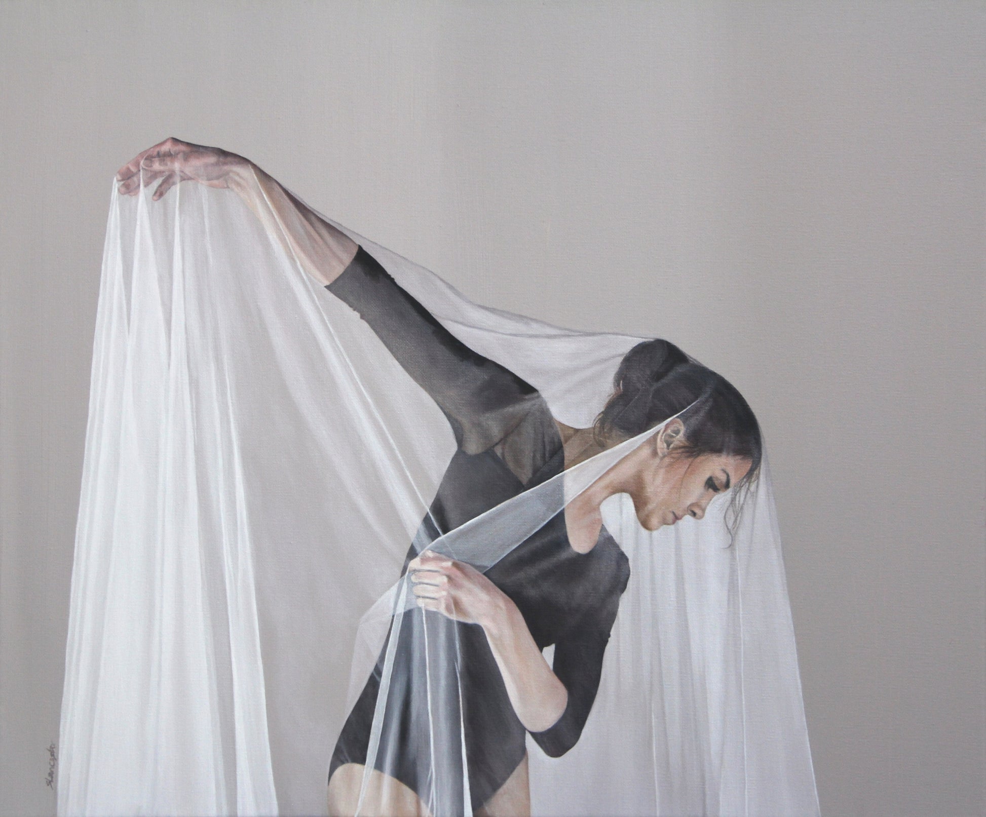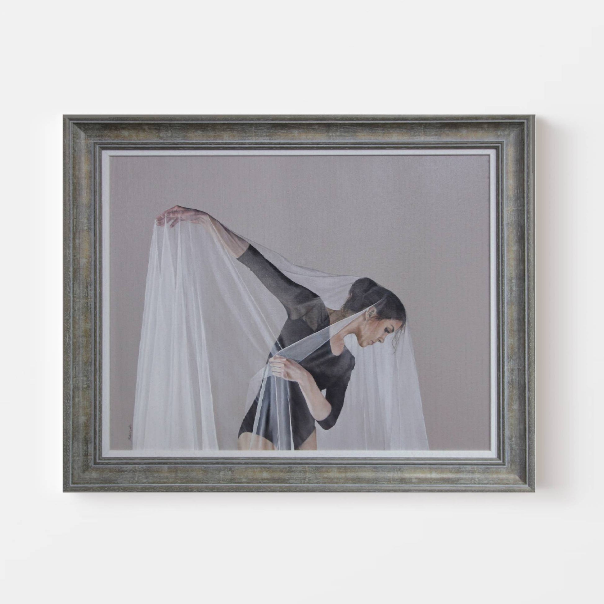 A figurative painting capturing a dancer in a moment of stillness and strength. The sheer fabric adds softness while highlighting her poise and precision. Produced with the utmost care and using the finest materials, this artwork comes framed and ready to hang, promising to enhance your collection with its calming presence.