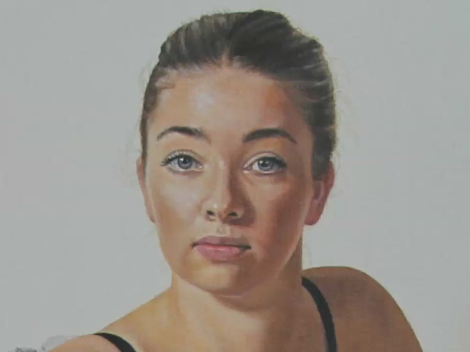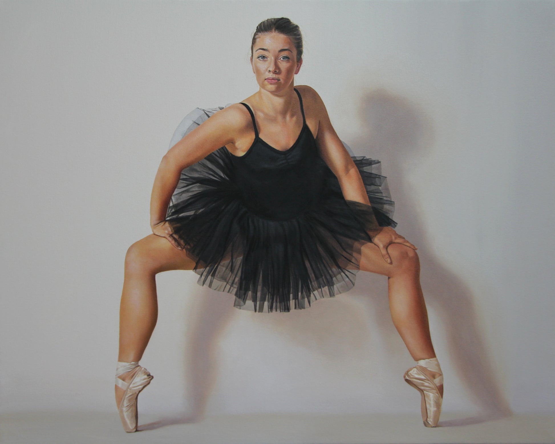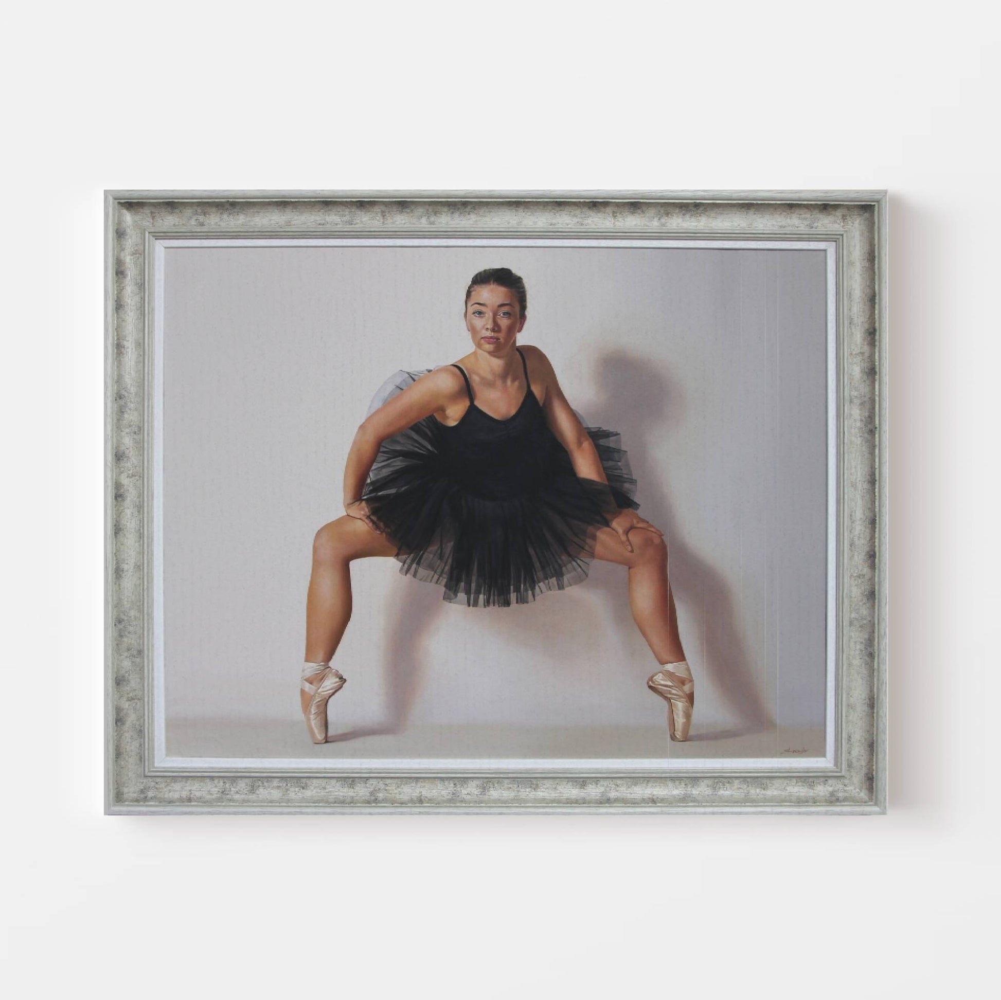 This painting captures the commanding presence of a dancer holding a strong, poised position. Her direct gaze and grounded stance convey resilience and confidence, balanced with the elegance of ballet. A striking piece that celebrates both strength and grace.