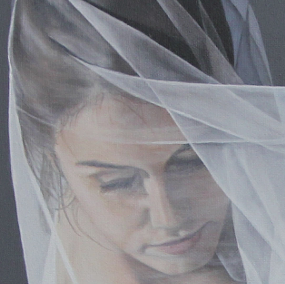 A dancer holding sheer fabric close, her gaze lowered and the movement contained. The painting leans inward, suggesting depth and self possession rather than outward display.